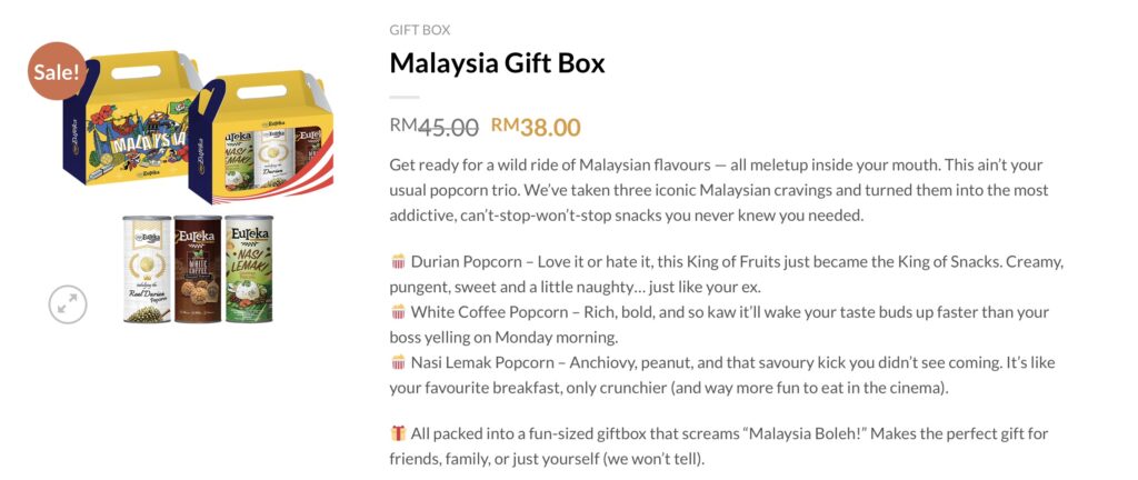 可愛いマレーシアのイラストのパッケージに、3種類のポップコーンが入っています。