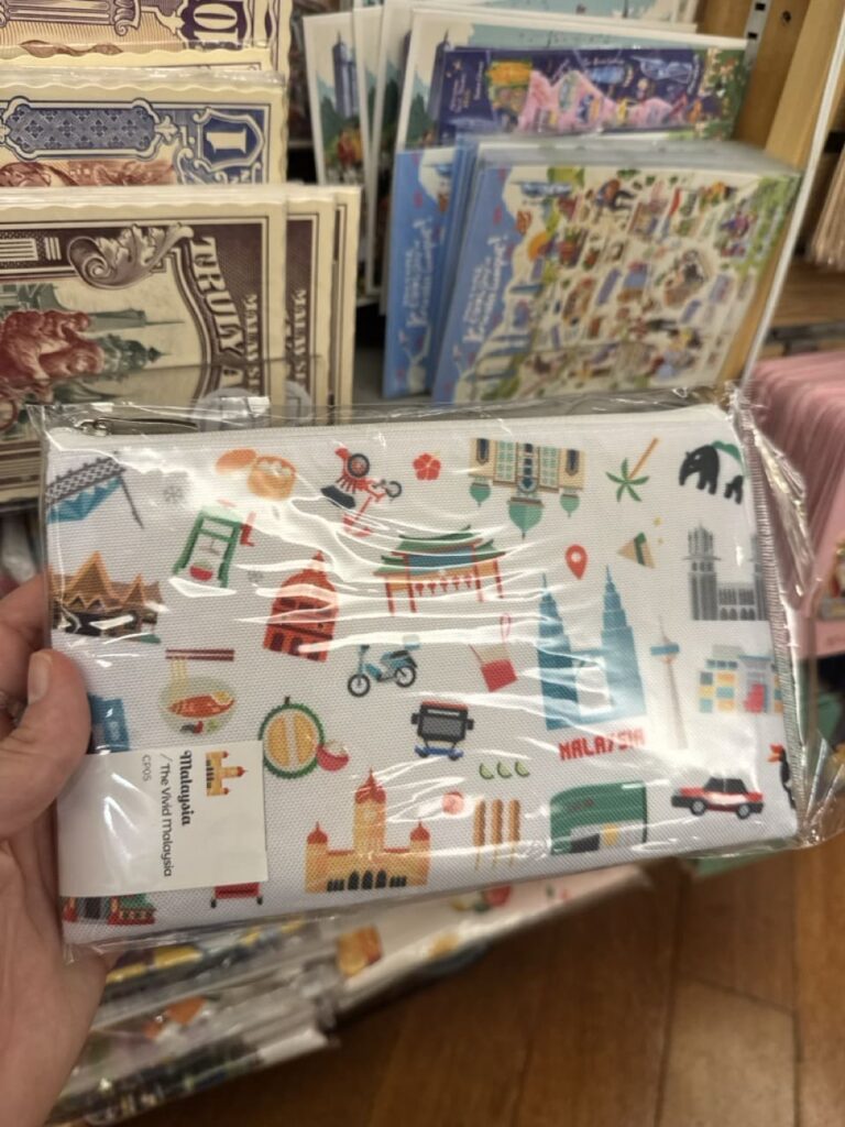 私は、マレーシアに関するもののイラストがたくさんのっているポーチと、マレーシアの文字になっているマグネットを上げました。