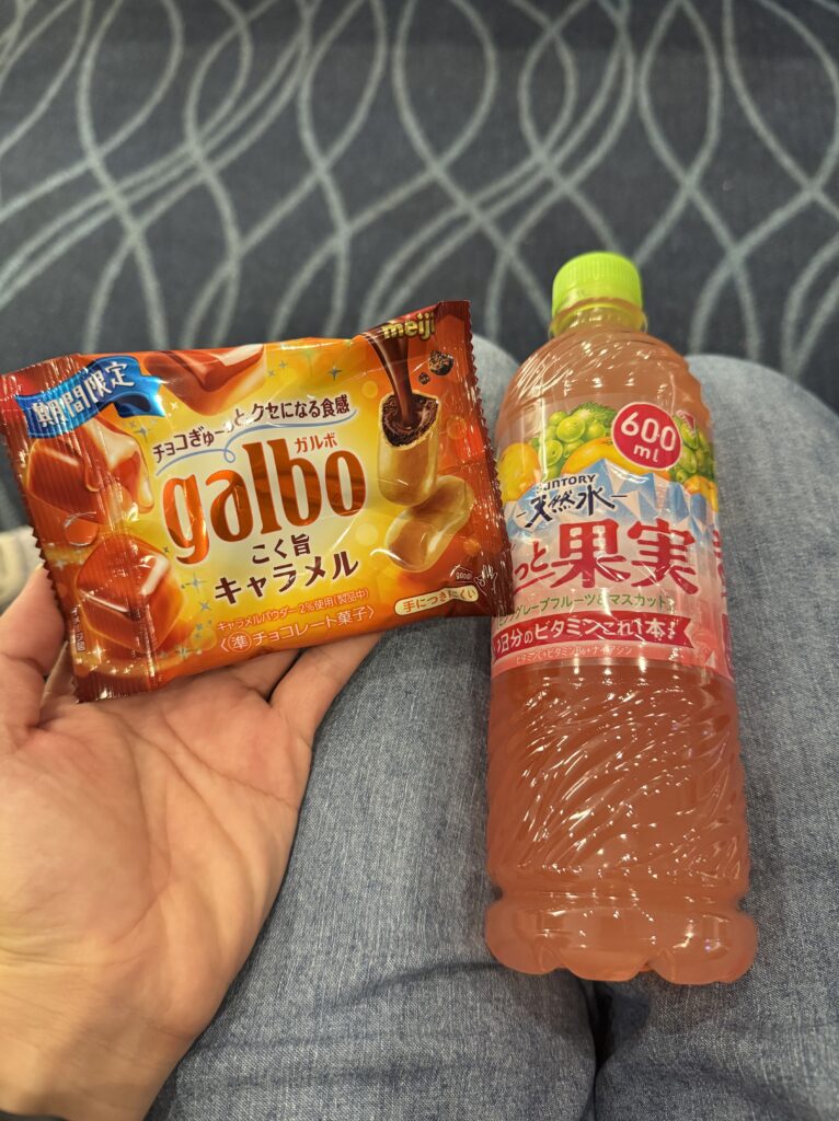 まず離陸してからすぐにお菓子とジュースが配られました。