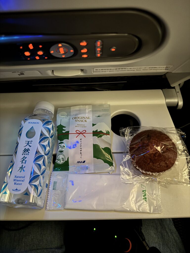 スナックパックの中身は、水・マフィン・あられ、お手拭きでした。